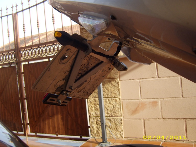 Yo no le hubiera puesto ese paso de rueda, aparte el porta solo debe de llevar 4 cosas claras, angulo de inclinacion (no superior a 30ª de la verticalidad), captadioptricos, (no puede estar encima de la matricula, ni cogido a ella), luz de matricula e intermitentes homologados, y ademas deberias de llevar guardabaros trasero, ya que si no lo llevas estas expuesto a que te multen (aunque como todo depende con quien des)