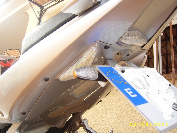 HOLA, solo hay dos intermitentes.Los dos intermitentes del costado son luces rojas de pare, que se encienden al mismo tiempo que el pare del piloto trasero.Se que así no pasa la itv, pero antes de eso, debajo del sillin puse un interruptor para anular las dos luces rojas.