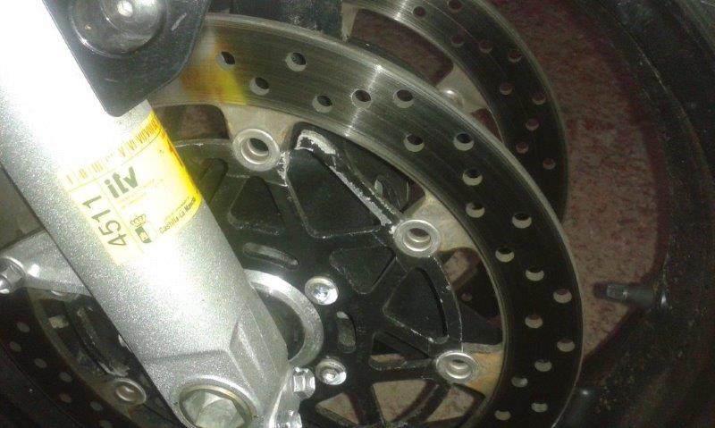 1º Cuando fui a probarla, el vendedor, muy honrado, todo hay que decirlo, me enseñó que el disco de freno delantero derecho tiene uno de los nervios rotos, que un día arrancó con el candado puesto y cascó. la verdad es que la zona de fricción del disco está en buenas condiciones y no se nota que esté alabeado ni nada cuando frenas, ¿Creéis que debería cambiarlos? Es que es la primera vez que veo algo así. Y de cambiarlos, mejor los de fábrica o alguna marca específica? Decir que no soy Michael Dunlop ni mucho menos, excepto por la barriga, que ahí le gano :carcajada: :carcajada: :carcajada: