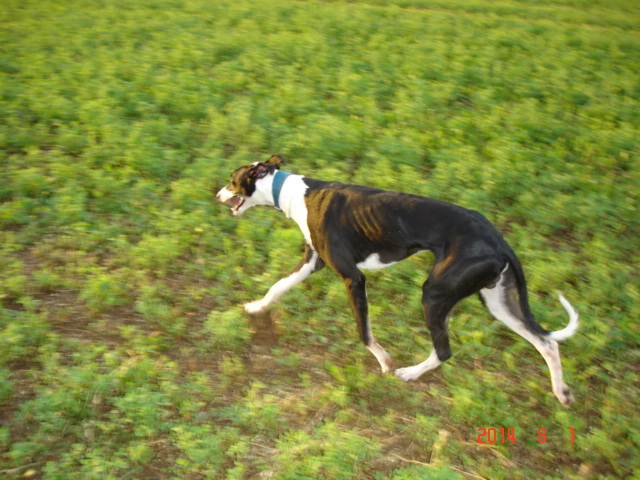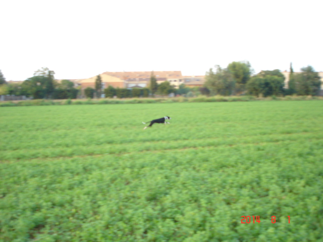 este pobre galgo , no para, a las 6 de la mañana con la fresca lo suelto en el campo hasta las 6,30 y me voy a currar, a las 7 se lo lleva Rosa de paseo andando por la orilla del rio, hasta las 11 que empieza el calor, a las 12 lo baja el peke, hasta la hora de comer,, y ya descansa hasta las 19 horas que llego de currar momento en que lo vuelvo a soltar en el campo hasta que quema el ultimo aliento de energía,, a las 21 horas esta durmiendo placidamente