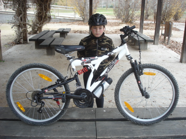 bueno pues el ivan se va haciendo mayor y tiene que ir dejando atras las bicis de niño. ayer sabado encontre esta preciosidad de segunda mano, con 34 km recorridos ,total y absolutamente flamante sin ningun arañazo, ruedas de 24 ( acorde con la edad del crio) por 85 € con la factura de compra que le pedi para que no fuera robada, ademas venia con algunos extras