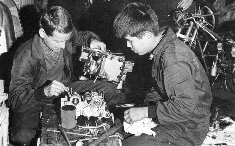 es el que esta junto al japo ( ya os doy una pista mas del origen de la marca que lo acojio) además de un magnifico piloto era un fuera de serie con la mecánica,, fijaros la cara de atención del mecanico japonés