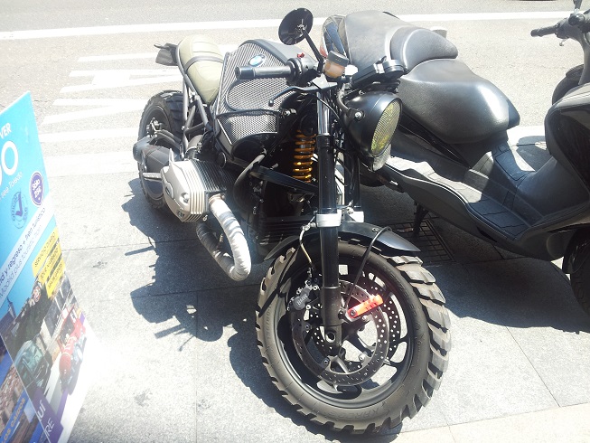 Con ese neumático subes el Everest si hace falta, pero 5 km por carretera y se te han caído las muelas del traqueteo, Aunque pintona la burra, un rato. ¿Es una NineT o una R1200 transformada? porque si no recuerdo mal la NineT llevaba horquilla convencional y esta lleva telelever...