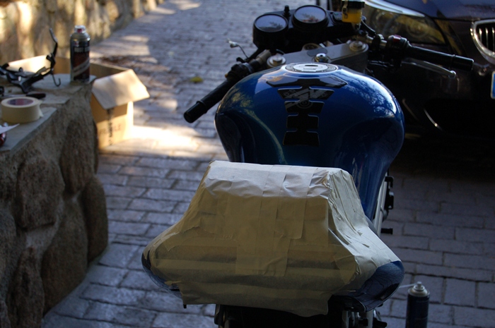 Un bote chusquero, que además es antioxido...pinté así el chasis de una Yamaha y quedó resultón (lo más importante a mi modo de ver las cosas es sanear los "hierracos", se ponen de oxido en jamelgas de esta edad...si fuese a ser un chasis que se viese lo llevaría a un pintor, ya que hay cosas que mejor dejárselas a los pros...las fibras y el deposito irán a un pintor, creo que es la forma de redondear una currada de este estilo... :bien: :bien:
