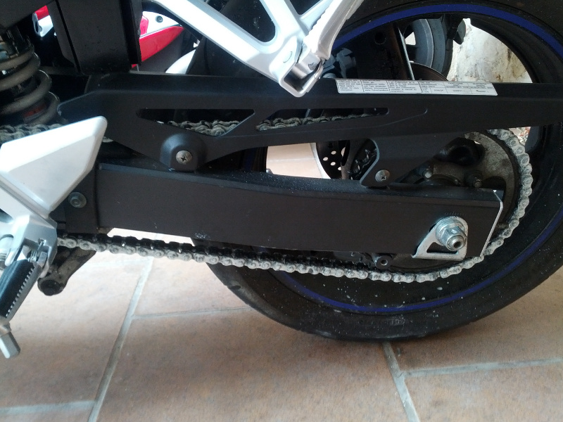 Mi consejo es el siguiente:nunca, NUNCA,engrases la cadena dejando la rueda trasera en el aire y con la primera puesta (motor en marcha,se entiende). Esto lo hace la gente para ahorrar tiempo,pero no serias ni el primero ni el ultimo que deje de poder contar hasta cinco con los dedos de la mano...