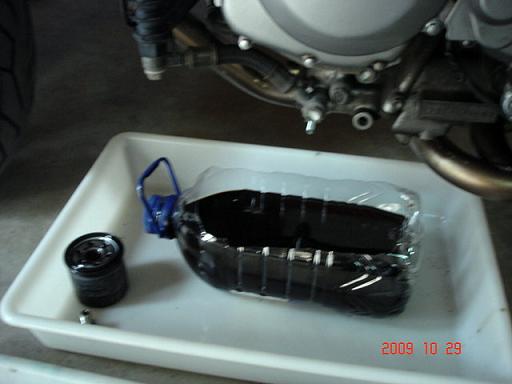 frank yo lo hago asi,,con ese tipo de garrafa recojes a la vez el aceite que cae tanto del alojamiento del filtro como del carter,,,una vez que empieza a gotear poco inclino la moto a derecha e izquierda y cae bastante aceite que se habia quedado por el carter,,,pidele al señor jim que ponga las fotos del brico que hicimos del ultimo cambio de aceite ahi se detalla paso a paso como hacerlo todo
