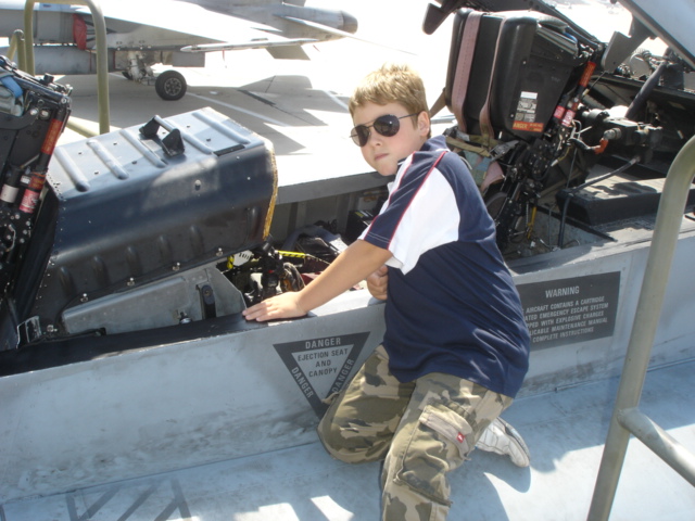 este se quedo sin escudo y sin gafas de sol,, que no dudo el crio en ponerselas inmediatamente,(las lleva en la siguiente foto), tras una charla a solas sentados debajo de un avion con este magnifico piloto y mejor persona , el crio cambio radical,, ha pasado a ser un crio brillante en los estudios, le dijo que el ingles era fundamental y desde ese dia sobresaliente siempre