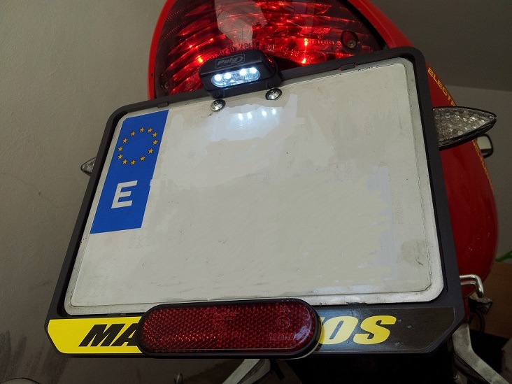 El portamatriculas era el original, pero hicieron la gracia de recortarlo, y ya con un acople pusieron la matricula justo debajo del piloto trasero, y los intermitentes.