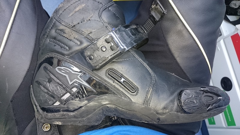 Mi punto débil eran las botas, unos botines Alpinestars smx-2, que son cojonudos pero de caña corta. Inexplicablemente, supongo que debido a la fuerza y peso de la moto, se me salió el botín derecho por los aires.
