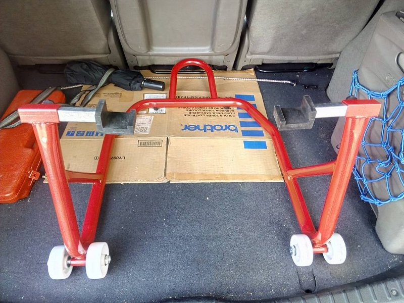 Fotos en vivo, con cinta métrica en mano. Ya véis que los soportes están sacados al límite (yo no pondría la moto ahí en esas circunstancias), y aún así pide unos 34 cm, cuando el basculante hace unos 31 ...