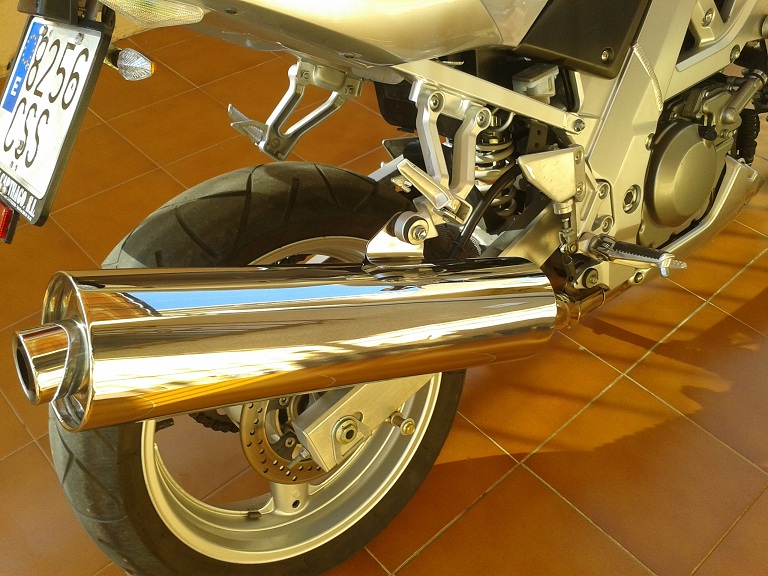 Bueno,solo quiero hacer un pequeño aporte para mostrar como arañazos profundos en el escape se quitan, y ademas el tipico color dorado que toma del uso, es totalmente reversible a su color plateado brillo.Esto se ha realizado en un antiguo trabajo mio donde tocamos acer inox etc, por lo tanto hay maquinaria para ello.Se usan discos especiales para acero y despues un buen pulido con su pasta y una radial con disco de lana y este es el resultado: