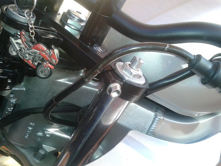 Bueno, solo comentaros que al final me decidí por el cambio economico:2 torretas,manillar renthal 758 y poco mas.El cambio es radical en cuanto a la postura y conduccion, maxime cuando estamos ya en los 40, manos dormidas y las muñecas rotas por la postura con semis.Se que hay partidarios y detractores de esta modificacion pero la moto me gusta y no me iva a comprar otra asi que ahi van algunas fotos por si a alguien le ayudan en algo.El que lo haga que no tenga miedo por las torretas,no se soltaran ni se quedaran con el manillar en las manos ni nada de eso.he visto tijas mas finas con torretas acopladas así y no hay ningun problema,eso si el tornillo de la torreta es metrica 12 y con su correspondiente refuerzo debajo antes de la tuerca.