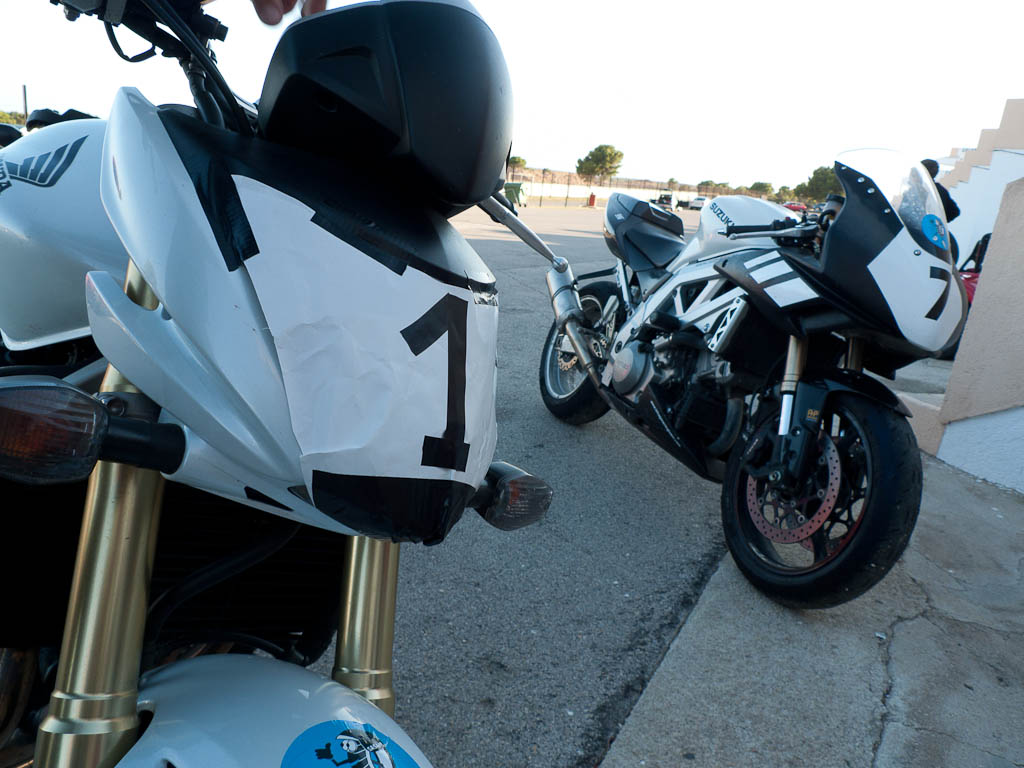 las mejores risas del finde creo que fueron las del sabado por la tarde tapando el faro de agusti con un papel de carniceria sacado de un cubo de basura + un numero 1 fabricado con cinta aislante ,,no nos dimos cuenta hasta que encendio la moto de que el papel era traslucido y que con la luz del faro se resaltaba el numero 1 produciendo un efecto optico que realmente acojonaba a los rivales jajjajaja