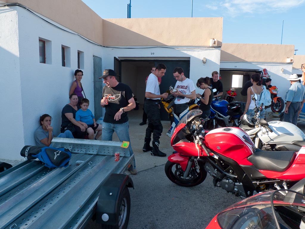 desde que Kocinski corrio el superprestigio, (Sera donde coño estas cuando te necesito...?), siguiendo en lo que estabamos, reencontrarme con Jose que recibio una llamada a las 6:20 de la mañana del servicio despertador del camping..., tambien estaban Juan con su ducatona, Frank que no pudo rodar mas que un par de tandas, Alex que fue el primero en poder apreciar el alto nivel de nuestro mecanico, Eli con sus nervios y su sonrisa(merece un comentario a parte),Ruben con su manillar renthal y que nos deleito un poco con una pequeña imitacion de la duquesa de Alba... y no se si me dejo a alguen de los que estuvimos en pista, y ademas tambien nos regalaron con su compañia Pablo y señora, Angel y familia, Jordi y la esposa de Alex, casi me olvidaba del amigo de Angel el "aleman" y señora, nada que un poco mas y tenemos que cojer un par de boxes, parecia un gran premio.