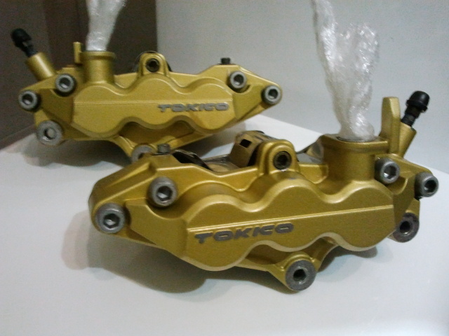Pinzas tokico axiales de 6 pistones por pinza provenientes de una Suzuki GSXR 1000.