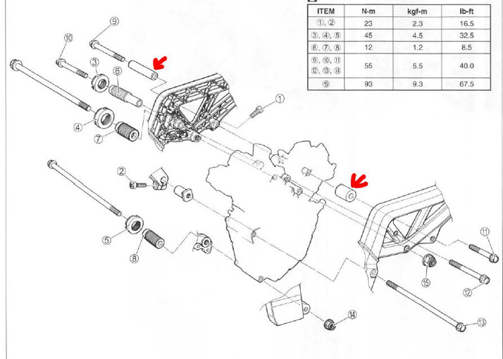 Tengo una SV650 2005 que estoy dejando para circuito con algunos "extras". Compré la moto de segunda mano y al quitar los tacos anticaida que llevaba instalados, me he encontrado que faltan los casquillos que deberían estar en el esquema del manual que adjunto.